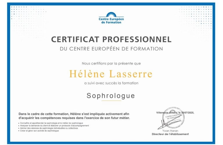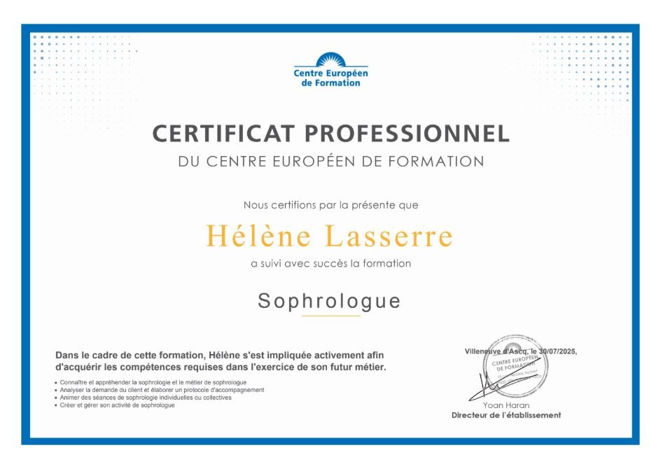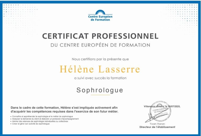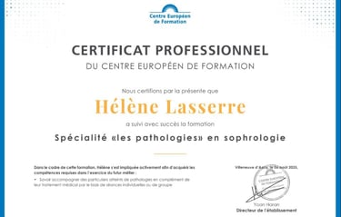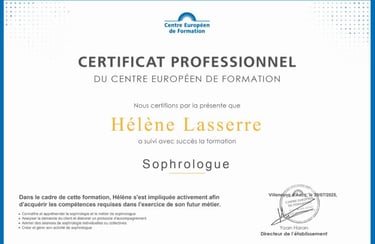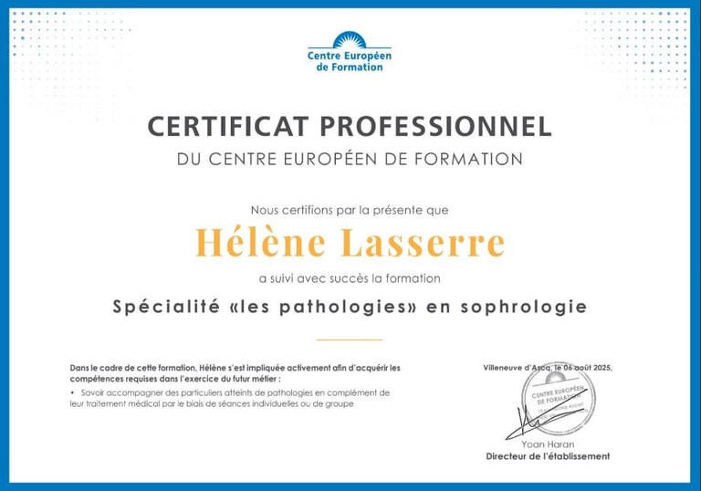 Pour garantir un accompagnement professionnel et de qualité, j’ai suivi une formation rigoureuse auprès du Centre Européen de Formation, avec une spécialisation en pathologies et addictions. Voici mes certificats attestant de ces formations.