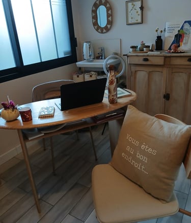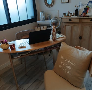 Les séances au cabinet vous offrent un cadre accueillant qui favorise une déconnexion complète de votre environnement quotidien et une concentration optimale pour votre accompagnement.